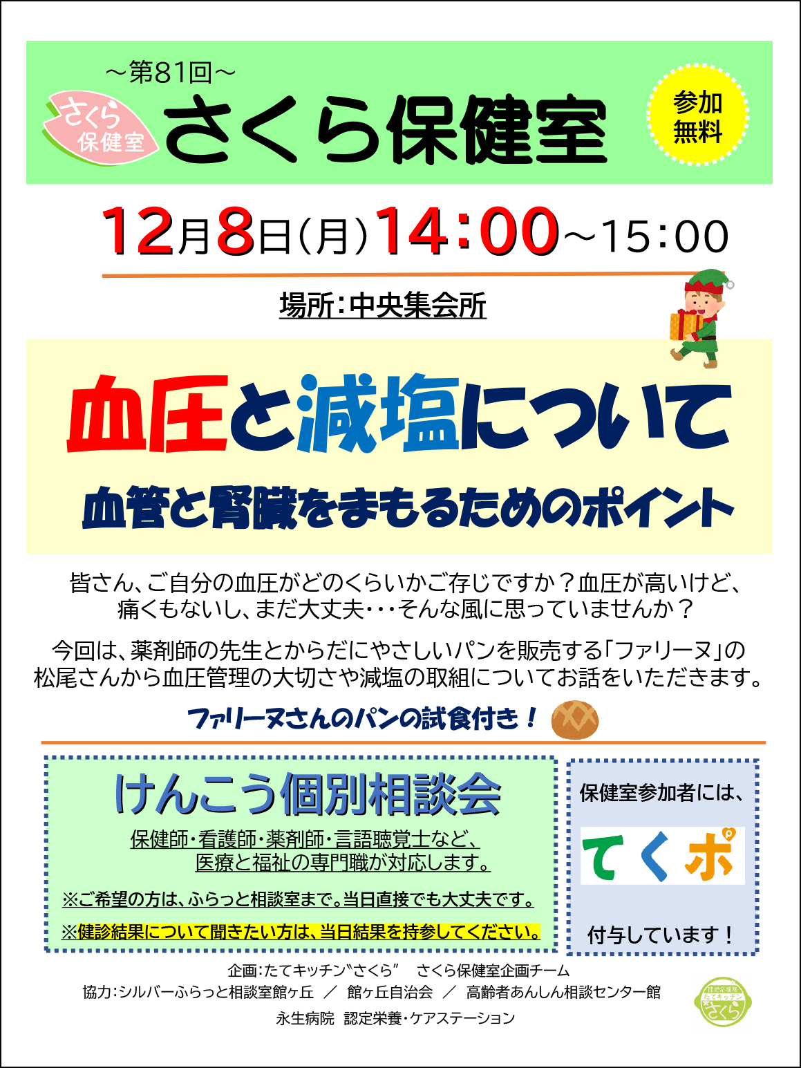 今回のさくら保健室は、血圧と減塩について ~血管と腎臓をまもるためのポイント~